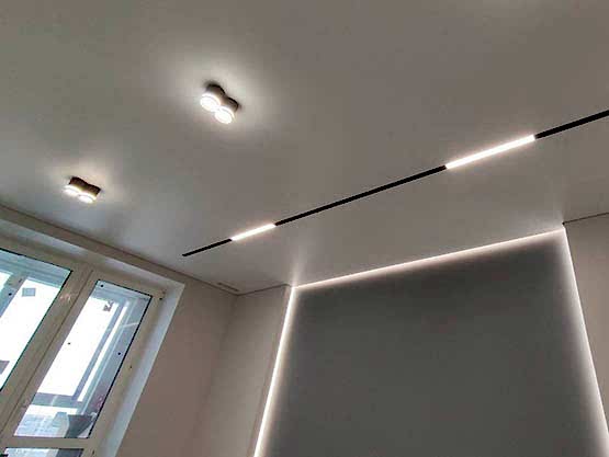 Все зависит от того, в какое помещение вы планируете установку. Смотрите портфолио, если хотите увидеть примеры готовых работ с любыми видами освещения, фотопечати и другими декоративными решениями. Если проект сложный, у нас есть возможность разработки индивидуального. Например, вы остановили свой выбор на натяжном потолке в гостиную со световыми линиями. Тогда мы рассчитываем, сколько метров светодиодных лент потребуется для полноценного освещения комнаты и какой должна быть оптимальная конфигурация линий. Если есть желание установить полотно с фотопечатью и Пин Ап освещением, выбирайте картинку из нашей базы изображений в высоком качестве. Небо с облаками, кроны деревьев, цветы хорошо смотрятся в гостиных, спальнях. А для детской лучший выбор фотопечать с любимыми сказочными героями ребенка. Стоит заложить дополнительно рабочий день для нанесения изображение на полотно, а на монтаж времени уйдет столько же, сколько на установку однотонного покрытия в один уровень. Квалифицированные мастера справятся с задачей за час-полтора.